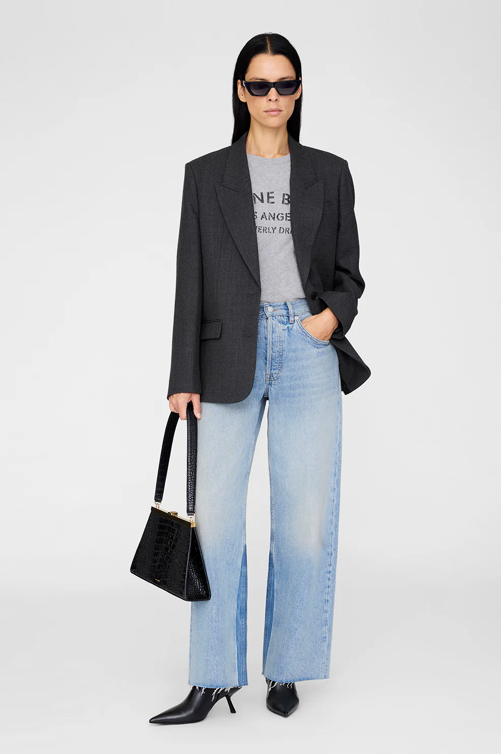 Modern sock booties made from 100% cow leather in a slight sheen. The Hilda Boots' sleek construction features a sharp pointed toe, low slanted heel, and high-shine outsole. Accented with gold-tone ANINE BING hardware at each heel.